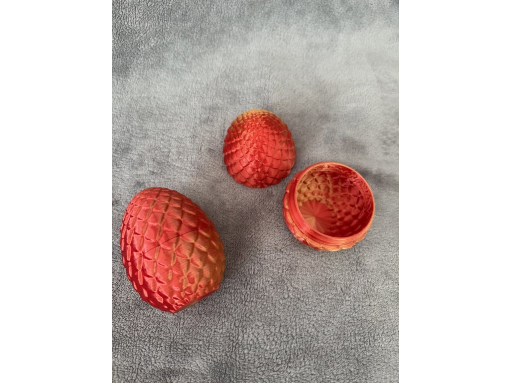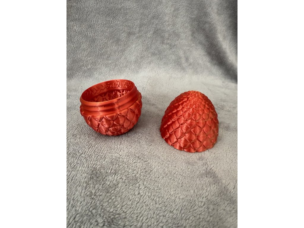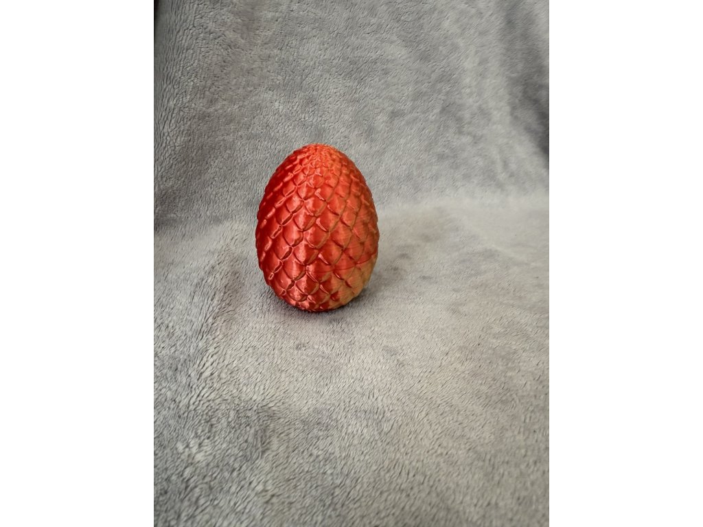 3D tištěné vejce s realistickými šupinami a metalickým červeno-zlatým přechodem (přesně jako na fotkách).