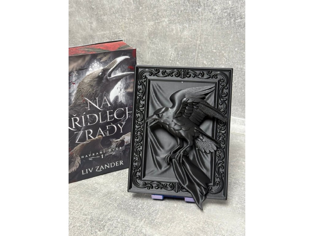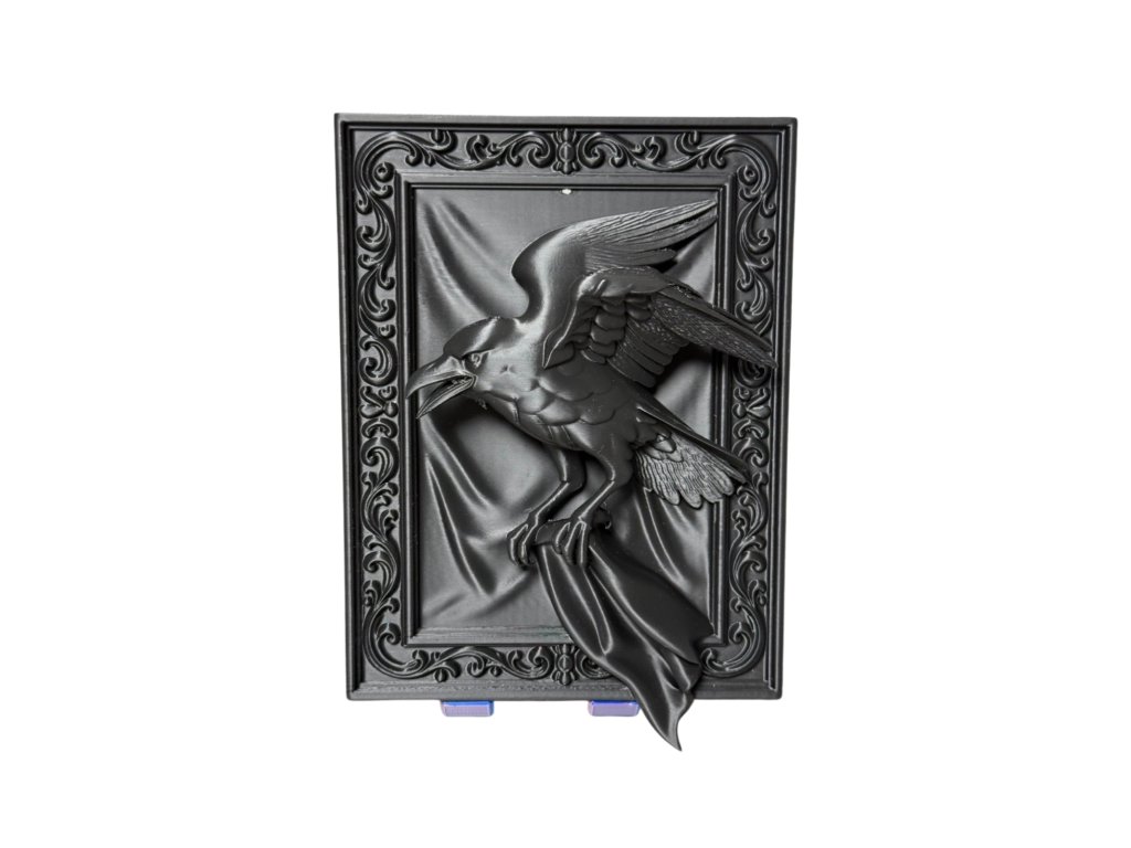 Matná černá barva a precizní 3D tisk dodávají dekoru temnou noblesu, která perfektně ladí k motivům havranů.