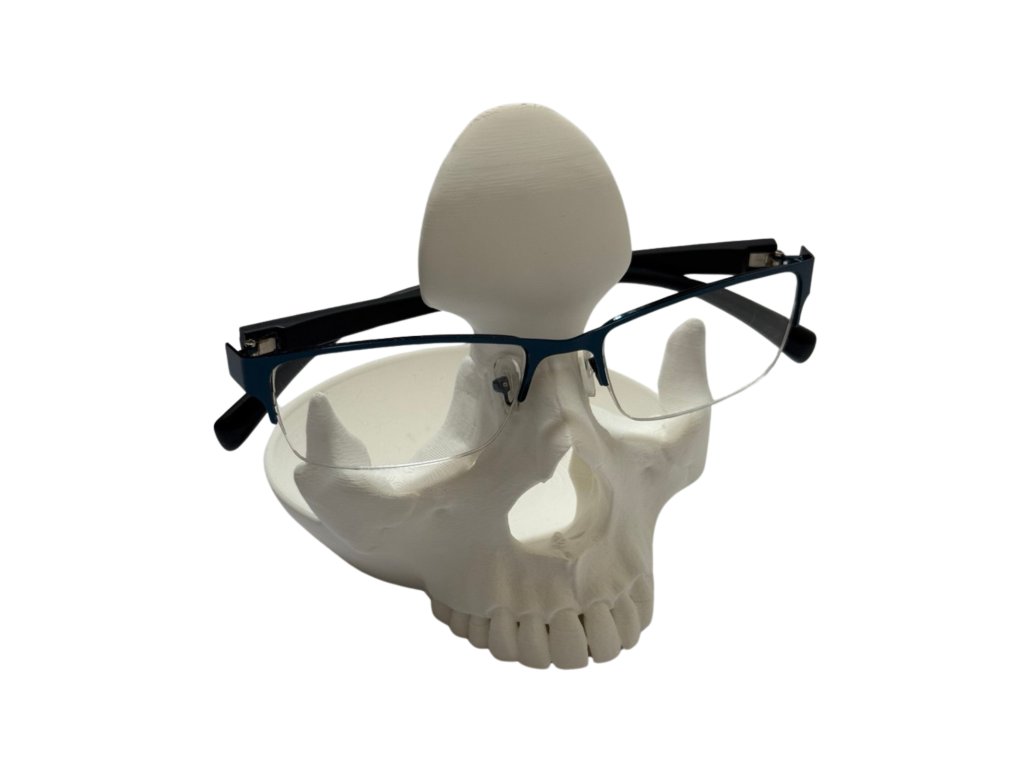 Originální 3D stojan ve tvaru lebky. Praktický a stylový doplněk na noční stolek, pracovní stůl nebo komodu.
